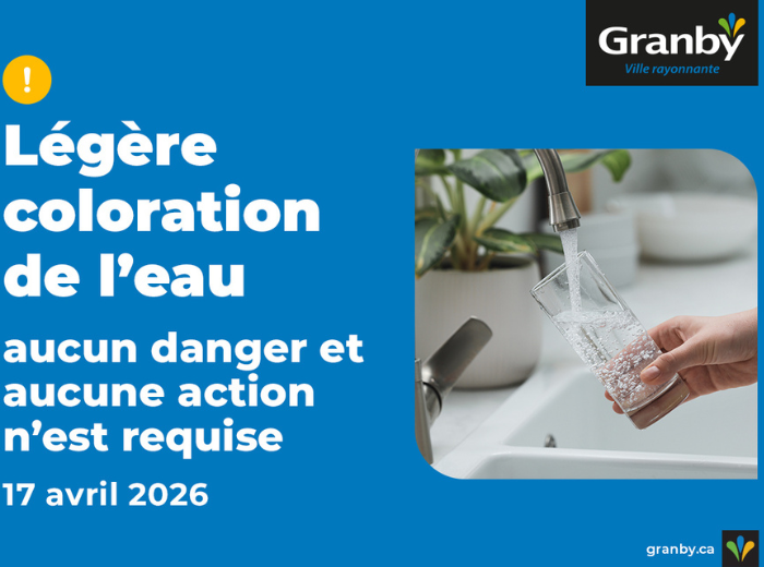 La Ville de Granby informe les citoyens qu’un avis préventif est en vigueur concernant l’eau potable, à la suite de travaux sur le réseau d’aqueduc.